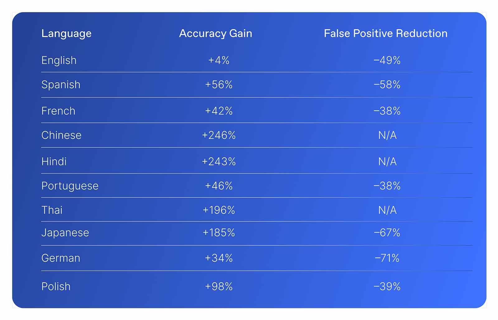 We benchmarked our new moderation model on Lakera’s internal Challenging Moderation Benchmark, a multilingual dataset designed to expose edge cases that often trip up moderation systems. Despite the difficulty, the new model achieved 60% fewer false positives overall while improving accuracy by over 200% in low-resource languages like Hindi and Chinese.
