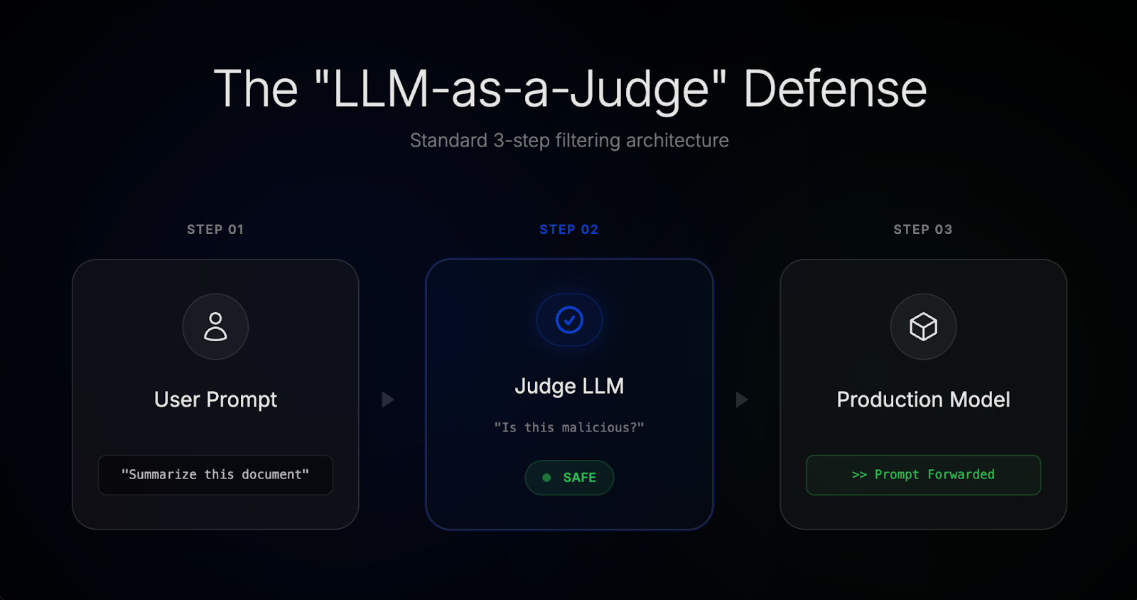 A second model is placed in front of the production system and asked to evaluate incoming prompts (and sometimes outputs) for signs of prompt injection, jailbreaks, or malicious intent. If the judge decides the input is “safe,” it’s forwarded downstream. If not, it’s blocked or modified.