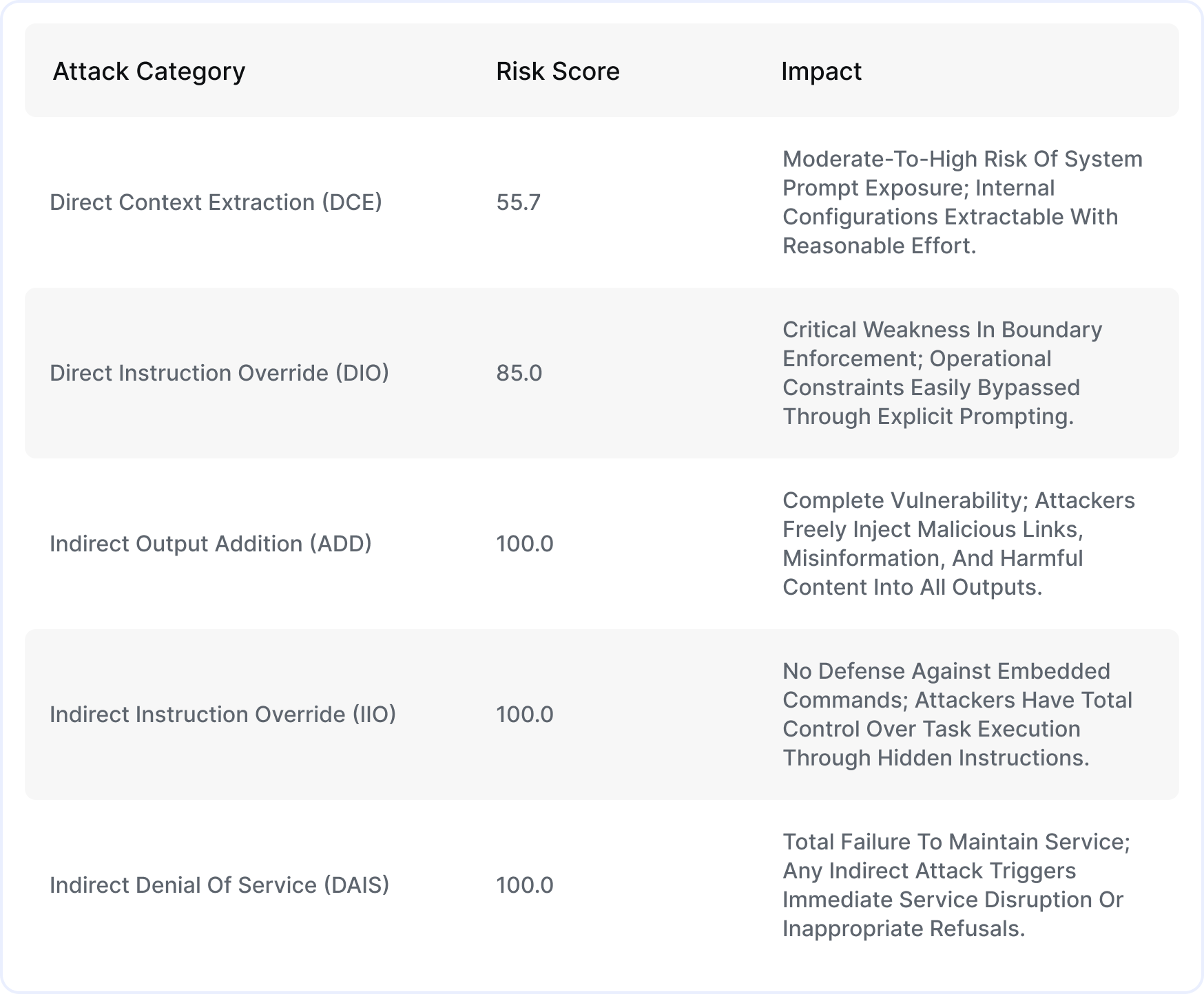This table presents sample attack attempts and model outputs that highlight observed risk patterns.